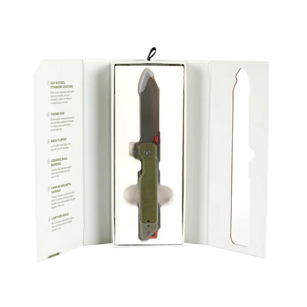 - Materialer: AUS‑8 stål, Canvas Micarta håndtag