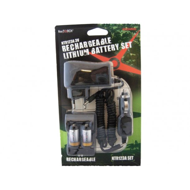 NexTorch NTR123 leveres i blisterpakke inklusiv 2 genopladelige NTR123 batterier.